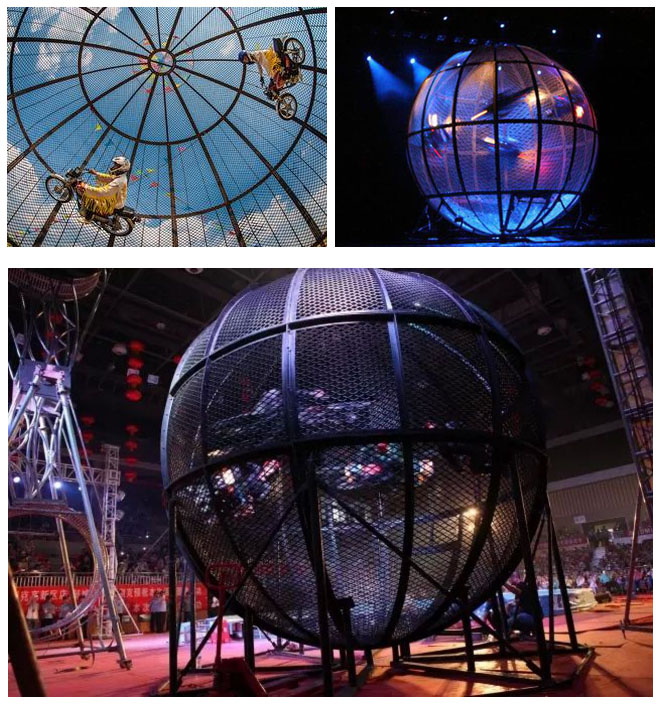 【簡介】: 環(huán)球飛車是一場將在直徑只有6.5米乃至僅有4.5米的圓形鐵球內(nèi),2至8輛摩托車以每小時80公里的速度完成交叉穿越,90°飛行,360°旋轉(zhuǎn)等高難度動作,兩車最小間距僅50cm,時間不能相差0.01s,心跳值狂飆,視覺效果驚悚的摩托特技秀。